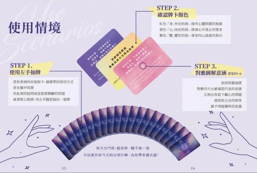 使用導覽書閱讀使用說明,透過牌卡使用情境示範與圖解,踏入旅程,尋找屬於自己的心靈之鑰。