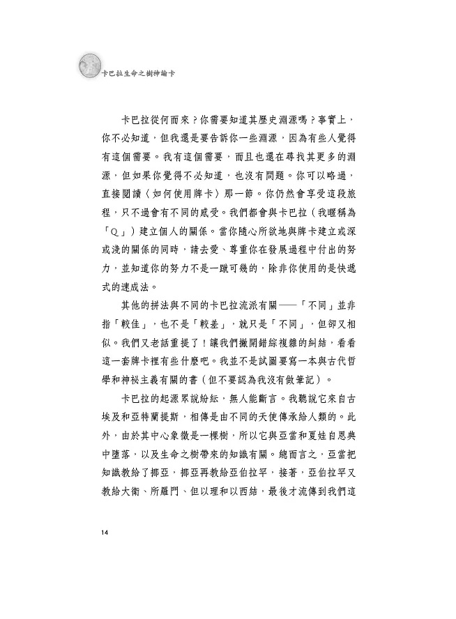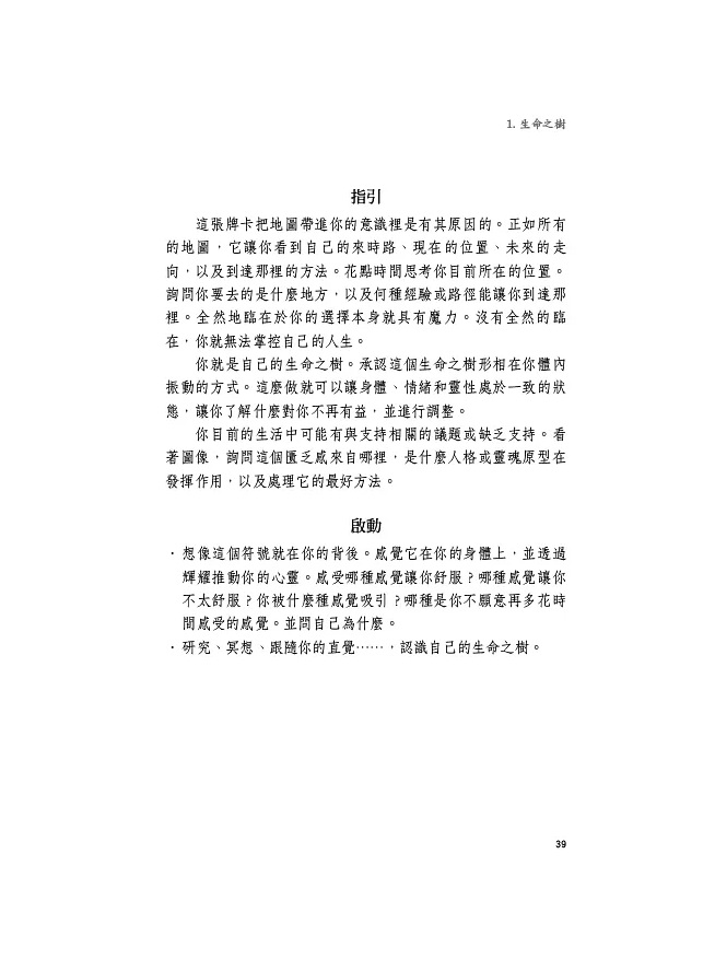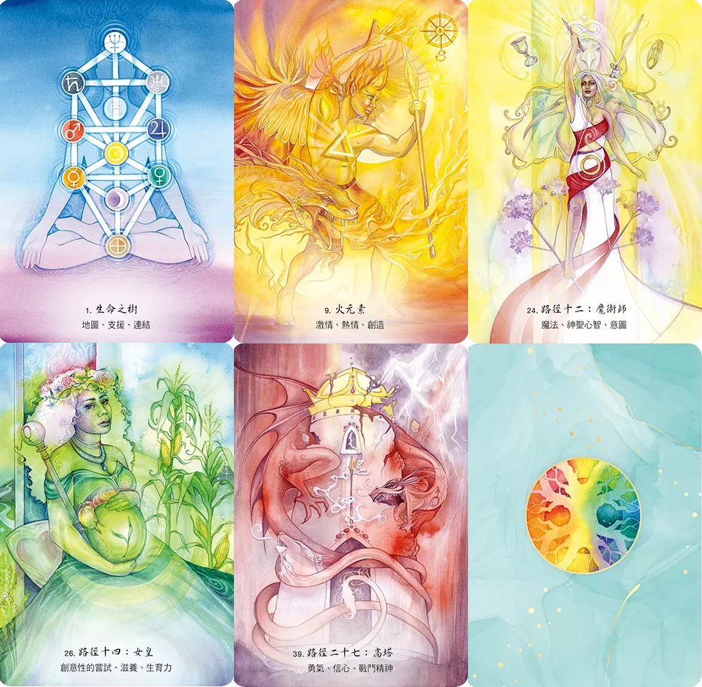 ◇ 對於喜愛塔羅牌的讀者來說,每個輝耀的編號都與小阿爾克那的數字有關。例如,第一輝耀王冠,也就是數字一,代表了塔羅牌中的王牌。二十二條路徑則呼應著塔羅的二十二張大阿爾克那。然而,牌卡上也畫有占星符號,亦可從占星的角度下手,以不同的方式解讀這三位一體式的神祕知識。