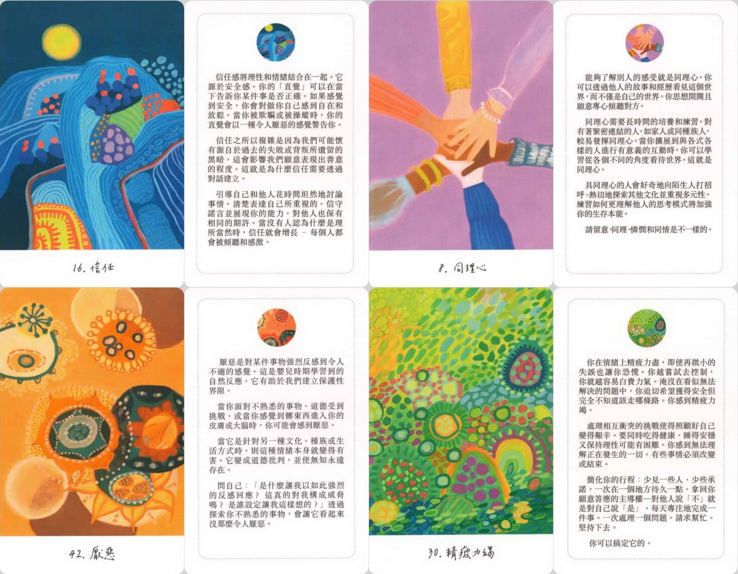 牌卡採用光譜配色方式排列設計,以顏色代表情緒所處的等級,搭配手繪插圖作為聯想的引導。紅色和橘色的卡片說明了沉重或難以負荷的情緒。當你發現自己處於「紅色區」,你將需要找到方法表達自己的感覺並消除造成這種感覺的原因。當你釋放沉重的情緒時,你自然會朝著「藍綠區」前進,達到更穩定和中立的狀態發展。我們的目標是使你到達「粉紫區」,希望在大多數的時間裡都感到平和與快樂。