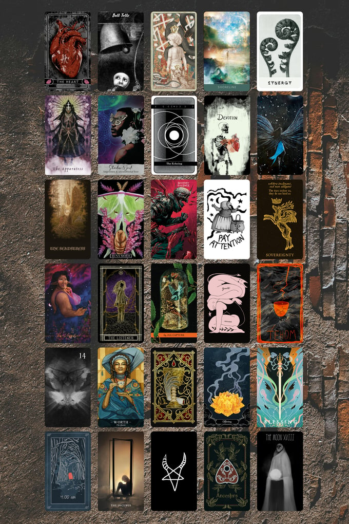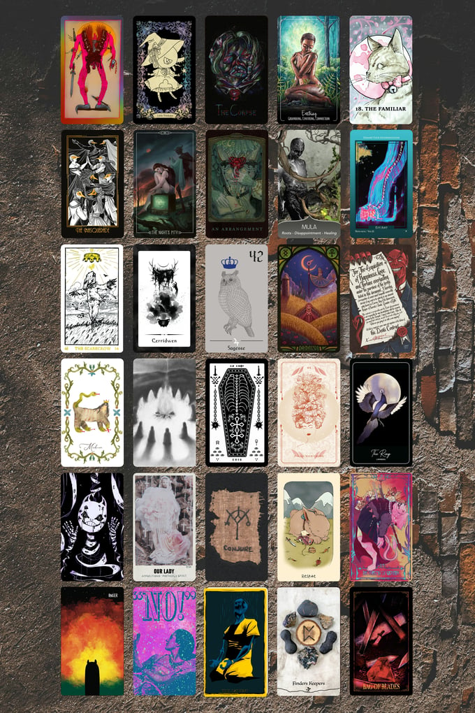 Each deck is made up of cards licensed from their original decks, cards made of art licensed from artists, or original art made just for this deck. A full listing of credit for each card can be found throughout the project, separated out by deck, including links to their work and where you can purchase the original decks.