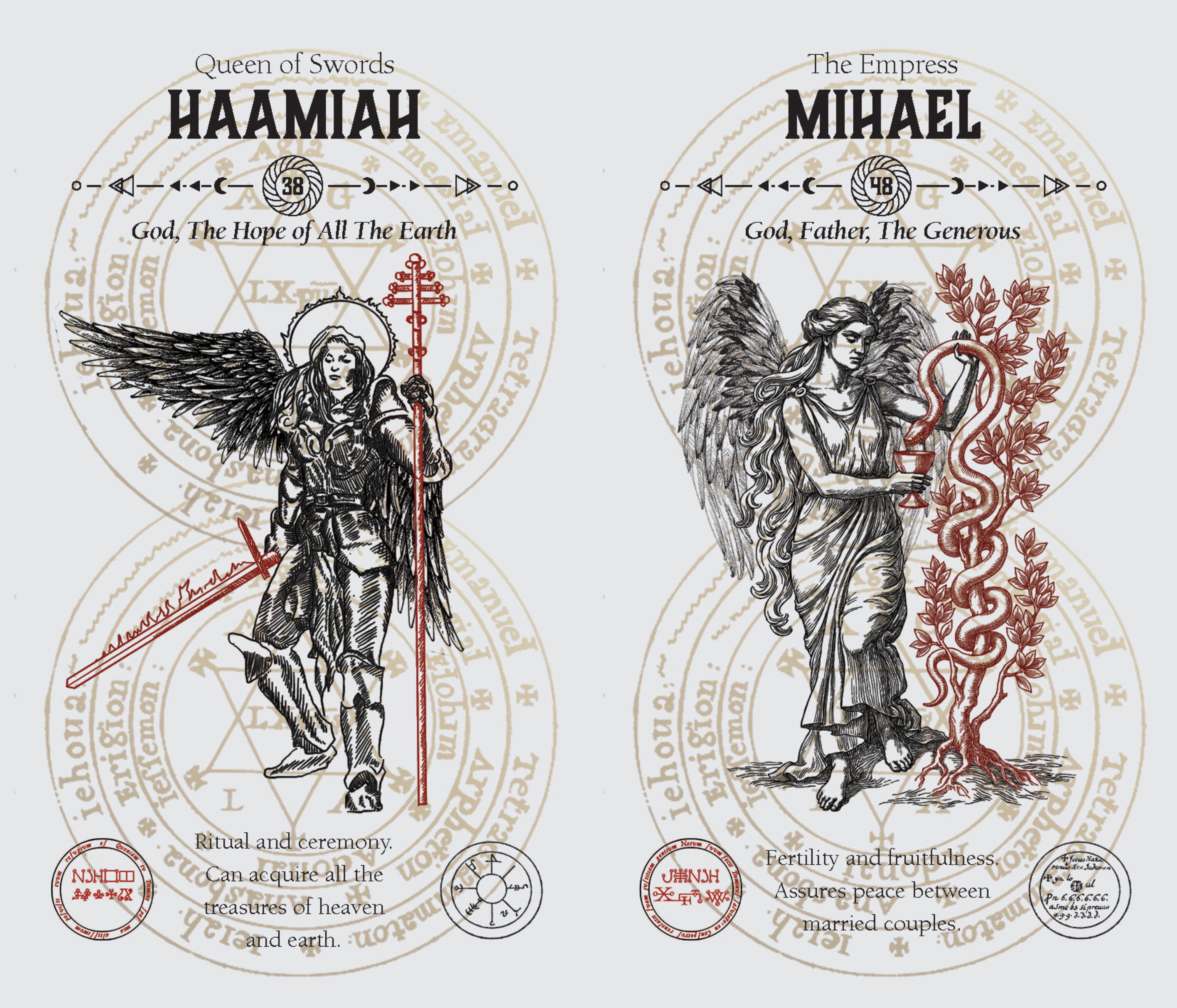 Find an intimate embrace in The Lovers with Archangel Haniel, move past challenges on The Chariot with Archangel Michael, discover treasures of The World with Damabiah or call upon divine justice from Caliel.