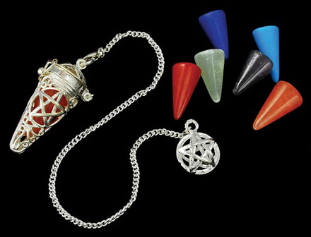 This elegant pendulum uses the symbol of a pentagram to create a silver tone cage. This cage is intended to contain one of the seven stones provided, helping to add its energy to your divination. Try each stone out and explore all of the answers that you'll find.