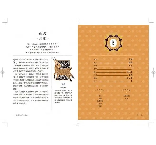 ◆神諭占卜書(尺寸: 19.5×14.5cm):96頁,介紹文化與歷史背景、占卜方式,以及符文的意義與對應元素