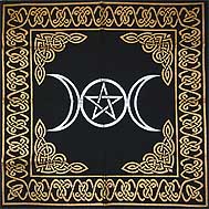 This charming cloth, is perfect for the medium sized table or altar and great for wrapping your tarot deck A silver triple moon symbol of the Goddess with a pentacle and golden Celtic border boldly jump off of the black background, instantly catching ones eye. The edges of this cloth are tasseled, extending beyond its overall width of 24".