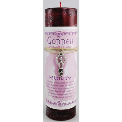 Intended to be a potent aid in your spells of fertility, this 6 " tall fertility candle provides an empowering energy to the magick of your ritual. Sweet scented, this crimson candle is intended to burn in ritual while wearing the necklace that comes with it-a 1 " representation of the goddess, with a spiral over her womb-to capture the powerful magicks of your spell and carry them with you, long after the ritual has ended.