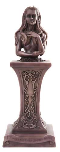 本產品需要付全數訂金訂貨,一般需時約 4-8 星期到貨。A classic design inspired by the works, practice and art of Raven Grimassi and Stephanie Taylor. This bust shows a naked woman covered only in her hair, crowned with a Crescent Moon and wreathed at the waist with leaves, flowers and vines. She is supported on a beautifully carved column that bears the inscription "I Evoke the Dark Sacred Night" on the front and Raven and Stephanie's names on the back. Cold Cast Resin