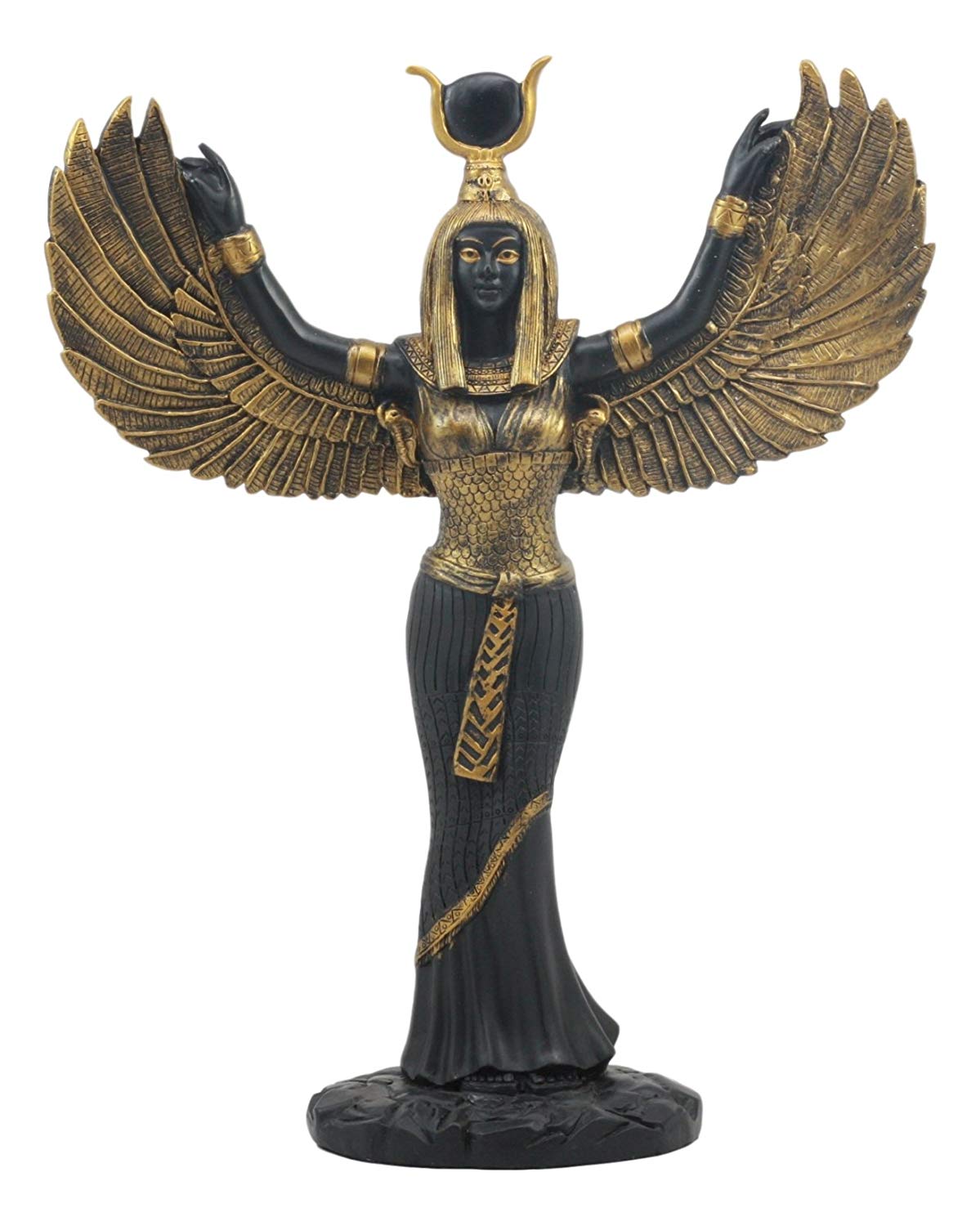 Isis is the ancient Egyptian goddess of magic, fertility and motherhood, and death, healing and rebirth. This sculpture depicts the beautiful Goddess standing in her robe of gold, as she spreads her wings out in protection and nurturance. On her head is the sun disc with golden cow horns supporting it.