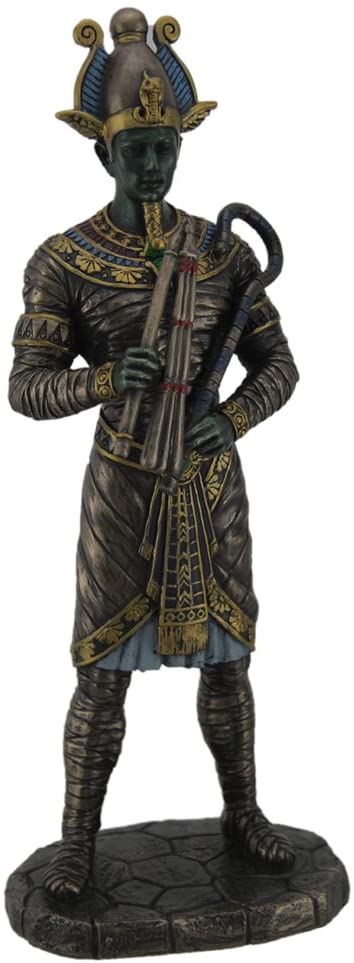 In Ancient Egyptian mythology, Osiris was the Lord of the Underworld and Judge of the Dead, brother-husband to Isis, and one of the most important gods of ancient Egypt. This incredibly detailed statue of Osiris features a metallic bronzed finish that give the statue the look of cast bronze, and has hand painted accents. Osiris carries a crook and a flail, symbols of kingship. Crafted of polyresin, the statue stands 10 1/2 inches high, 4 inches long and 3 inches wide. It's a great decorative piece for anyone interested in Egyptology.