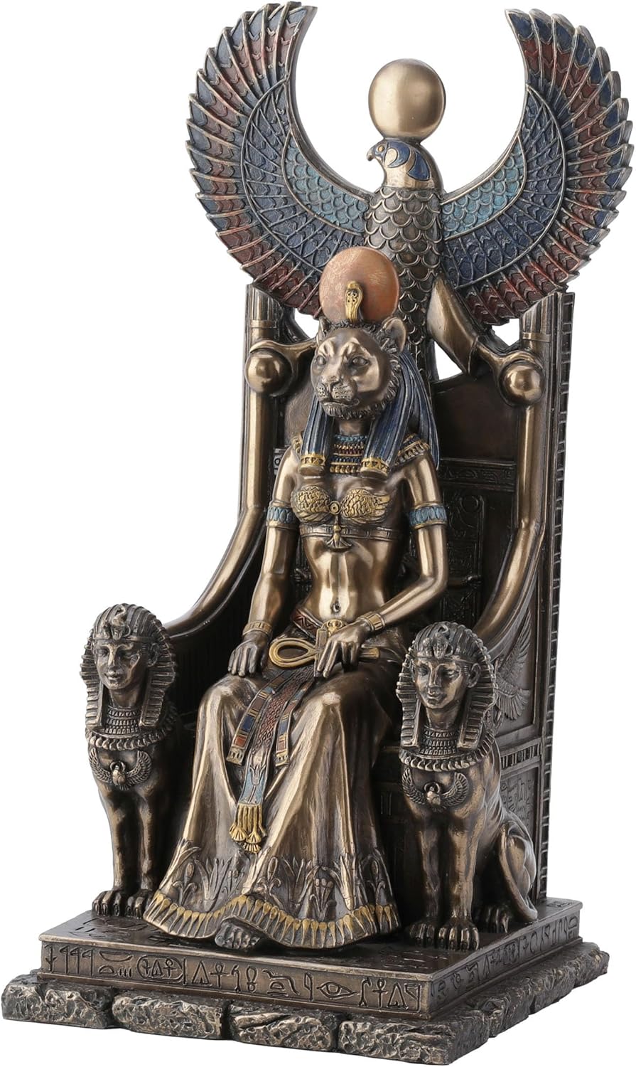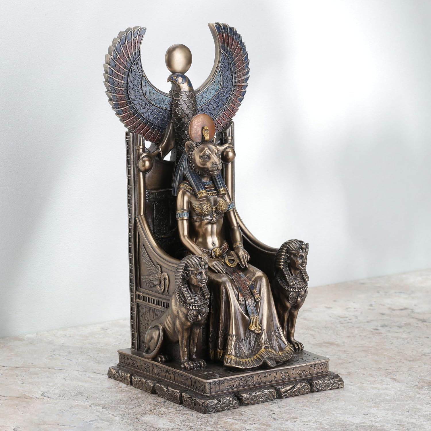 本產品需要付全數訂金訂貨,一般需時約 4-8 星期到貨。Sekhmet, Egyptian warrior goddess of healing, led the Egyptians fiercely into battle. Her ferocious lion visage attests to the courage and brutality of her spirit. In this gorgeous depiction, Sekhmet reigns from her throne as protector of pharaohs. Her adornments, crafted in stunning detail, all establish her as Egyptian royalty. She wears a uraeus diadem which represents divine authority. She wields a long crane-headed staff of earthly sovereignty in her right hand and the ankh symbol of eternal life in her left. Beautifully crafted from cold cast resin, this statue looks and feels like a genuine Egyptian artifact with a bronzed color finish and blue/gold painted accents. A perfect size to show off in any book shelf or display cabinet, the statue measures 11 inches tall, 5 inches wide, and 5 inches deep. According to legend, Sekhmet created the desert with her breath. We can`t guarantee she won`t turn your home into a desert but she will certainly adorn it with an elegant Egyptian accent.