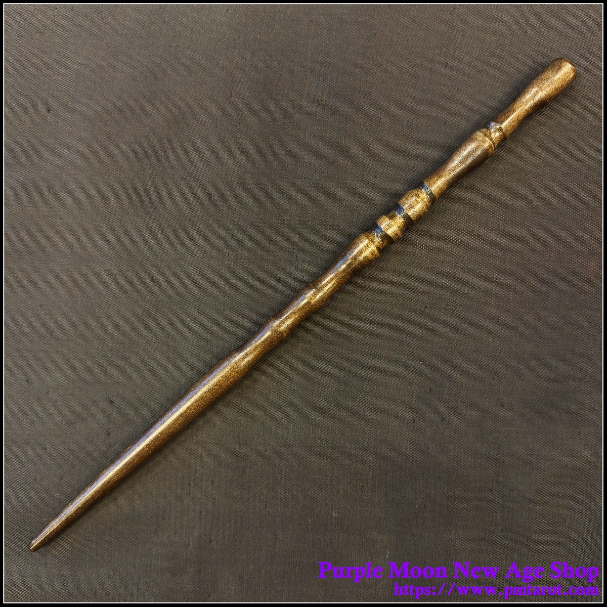 This wand is made from one piece of Birch, making it nice and sturdy for years of spellcasting. The handle has been given a solid dark stain; the tip has had the stain rubbed off, leaving the grain to show through.