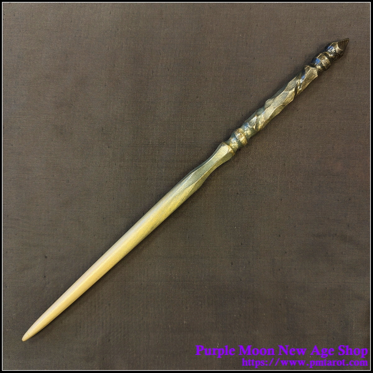 This wand is made from one piece of Birch, making it nice and sturdy for years of spellcasting. The handle has been given a solid dark stain; the tip has had the stain rubbed off, leaving the grain to show through.
