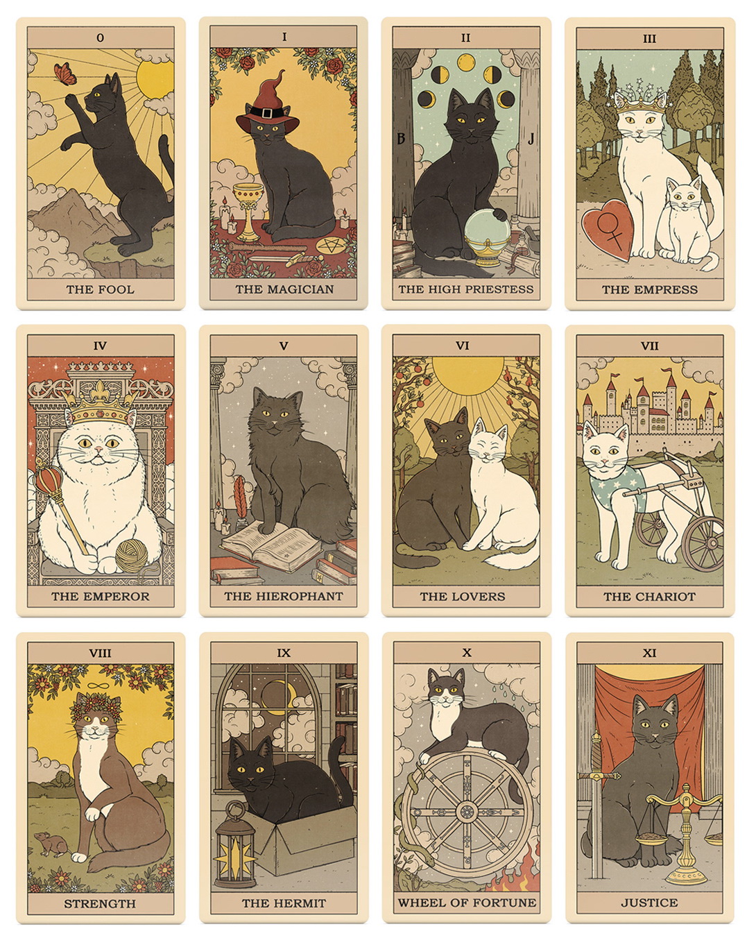 這套 78 張塔羅牌套裝以貓為主題,將古代神秘主義與貓科動物插圖相結合。這套塔羅牌和使用指南套裝非常適合任何尋求學習古代塔羅藝術所需知識和技巧的人。