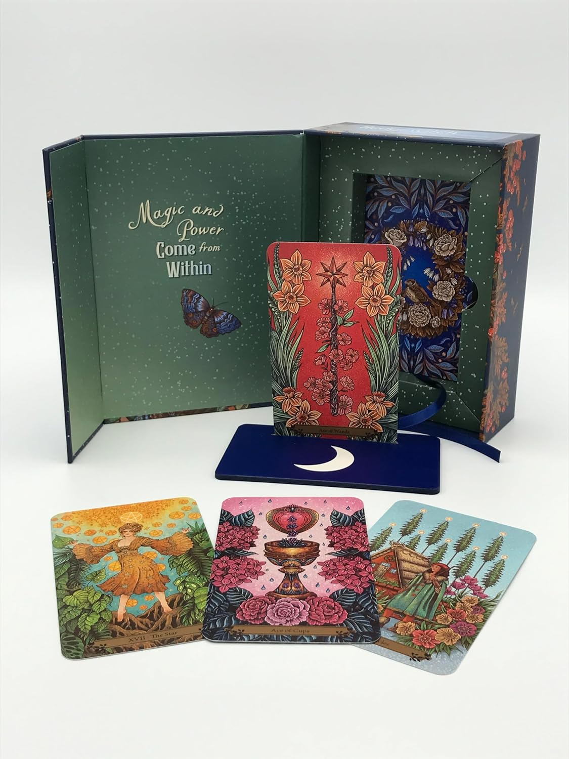 Layered with significant, nature-based imagery, the major arcana signals that the other world is near, while the suits of the minor arcana correspond to the four seasons. Wands embody spring energies, cups represent summer, swords symbolize autumn, and pentacles portray winter. Includes 78 cards with a matte, linen finish; a 224-page, color guidebook; and a reading altar.
