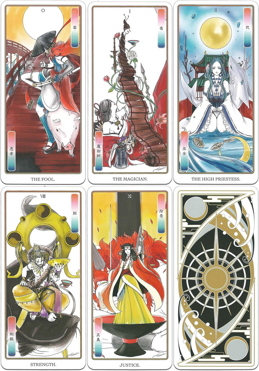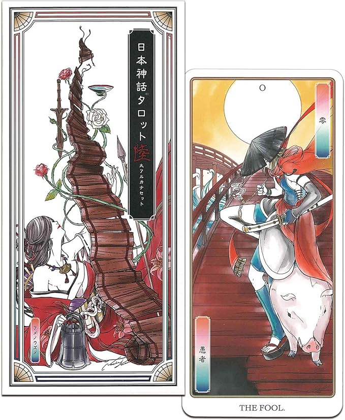 ライダー(ウェイト・スミス)版、マルセイユ版のタロットカードをベースに、大アルカナ零(0)番『愚者』には、ヤマトタケル、壱(1)番『魔術師』にはアメノウズメ、弐(2)番『巫女(女教皇)』にはタマヨリヒメ、参(3)番『女王(女帝)』にはスセリヒメなど、内容や雰囲気に合う日本神話に登場する神たちが当てはめられています。
