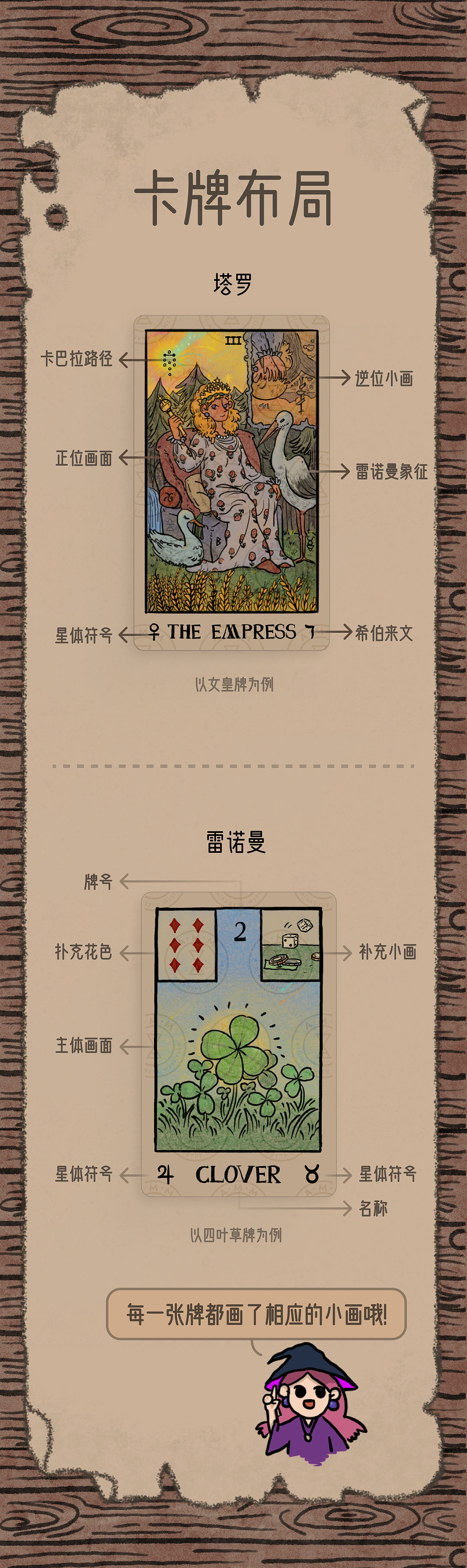 除了本來的 VIII Justice 及 XI Strength 替換牌外,額外還有七張牌,分別是:Tree of Qabalah, Weekday Heptagram, 12 Signs of Zodiac, Tarot in Zodiac, Essential Dignities, The 4 Elements 以及 Runes