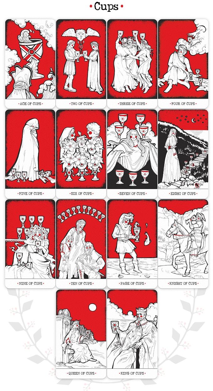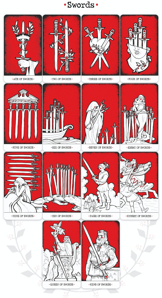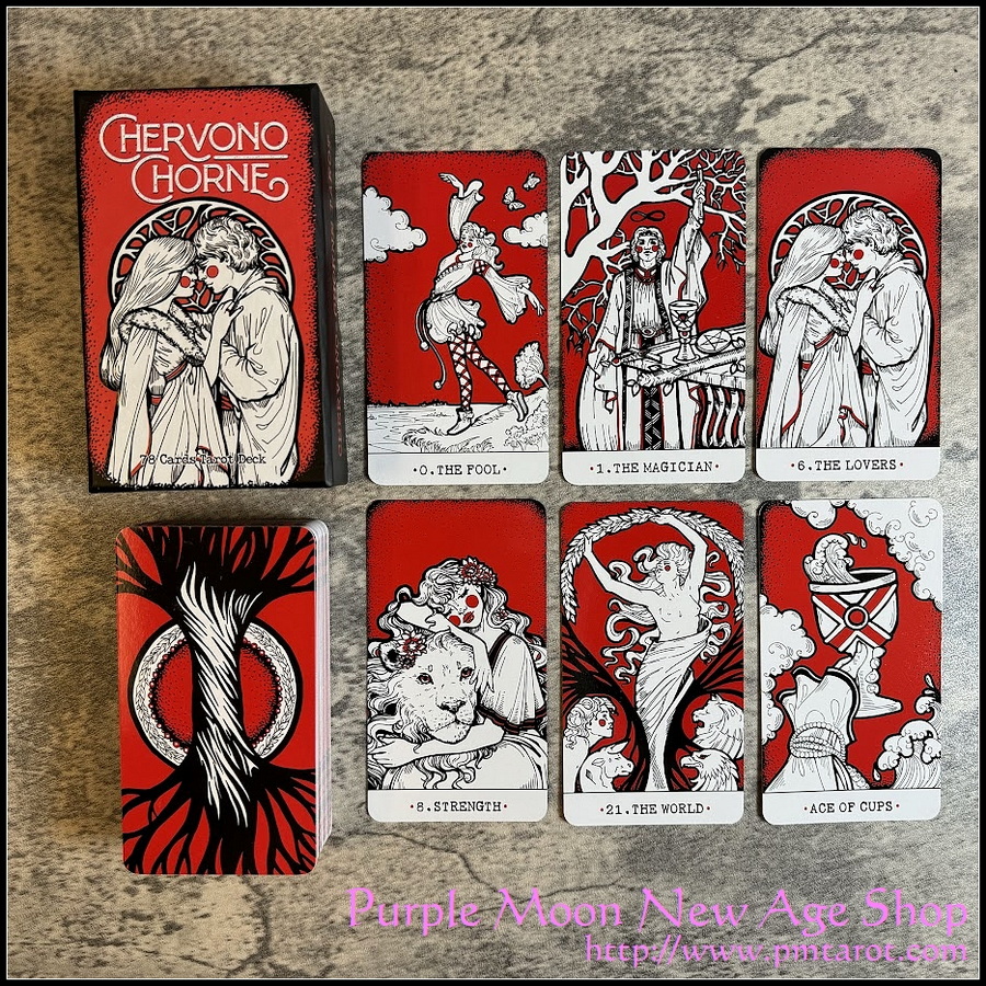 Chervono-Chorne Tarot is a modern version of the classic A.E. Waite deck represented in only two colors − red and black. The imagery is very close to the classical tarot cards, but the entourage references Ancient Greece. The personages wear tunics and laurel wreaths, and mane cards feature elements of ancient architecture.