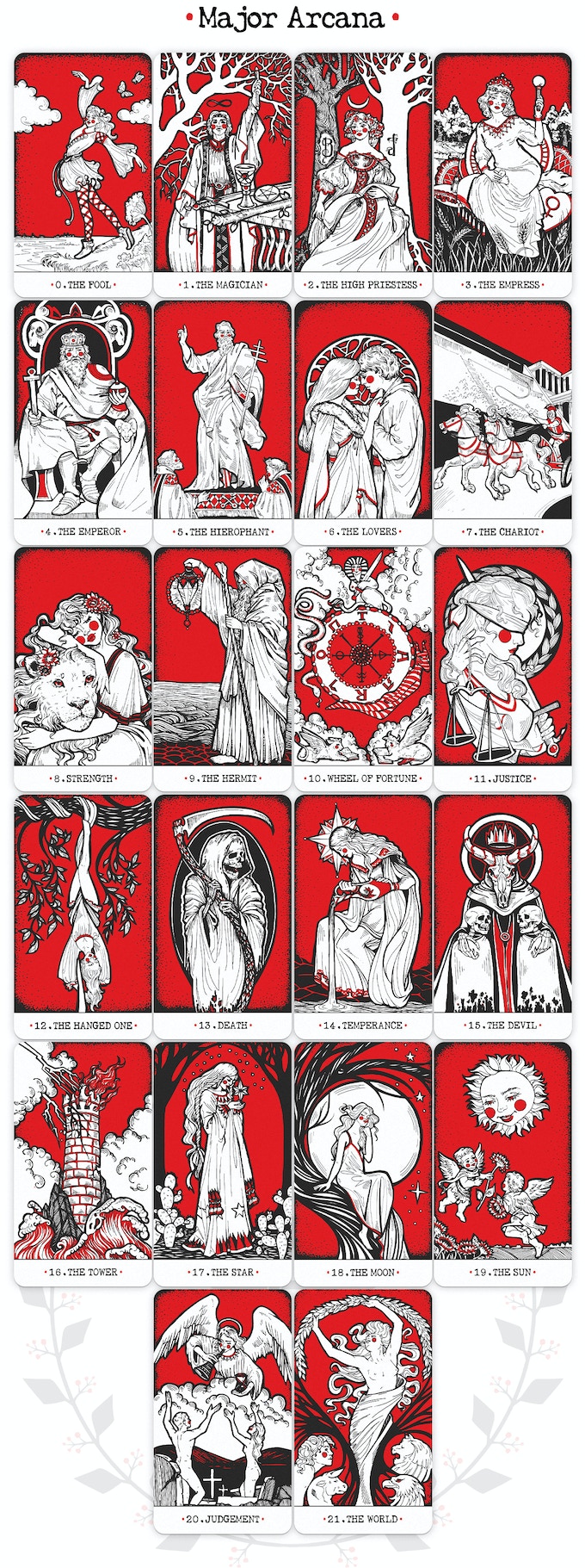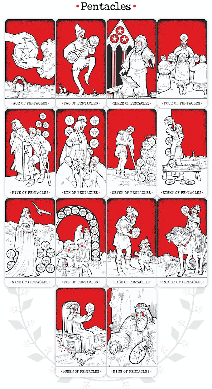 The Minor Arcana are made more concisely, while the Major Arcana are more detailed. The author believes that the most important is the person, especially the facial expression, so the personages are given a more detailed representation, whereas the landscapes are schematic.