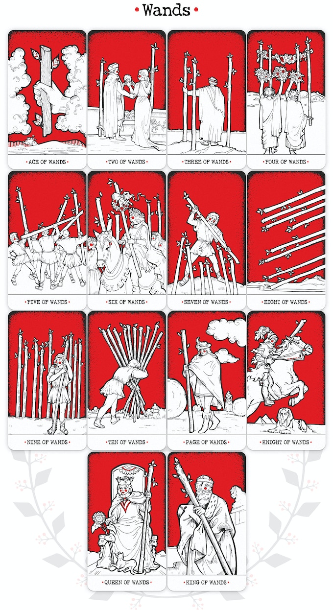 Even though the card’s imagery is very close to the classical tarots, the author allowed himself some liberties. For example, at the feet of the Queen of Wands, there is a white cat instead of a black one, and the angel from the Judgement holds an hourglass in his hand, which indicates that the time has come!