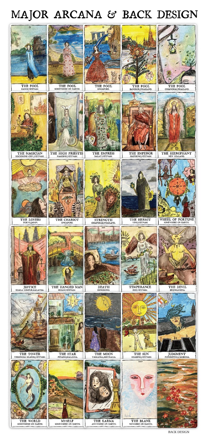 The deck comes with a set 85 cards. The special cards are 5 card of The Fool that represents 5 elements: Earth, Water, Wind, Fire and Spirit and the 3 signature cards of the artist: Karma, Myself and the Blank.