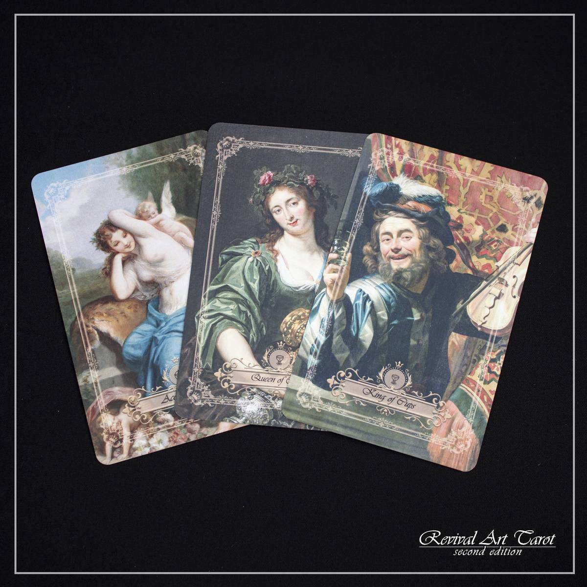 The “Revival Art Tarot Second edition” deck consists of 78+4 cards covered with a protective coating and a guidebook with keywords. The size of the cards is 80x130mm (3.15in x 5.12in).