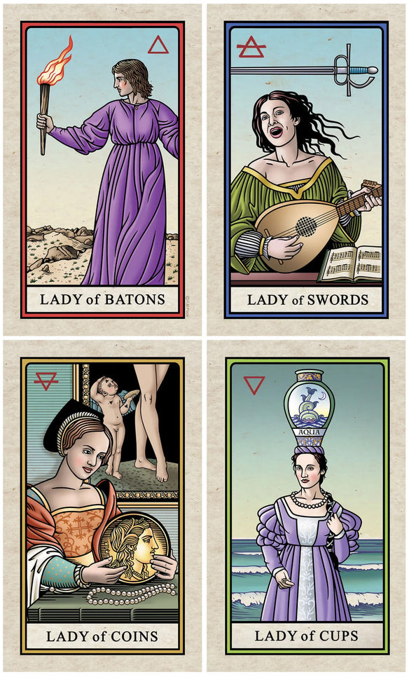 The four minor suits are related to the four alchemical elements—Earth, Water, Air, and Fire—and each element corresponds to one of the four functions of consciousness described by Jung: sensation, intuition, thinking, and feeling. Thus, the feminine elements align with the passive observational functions: sensation and intuition, and the masculine elements align with the active decision-making functions: thinking and feeling.