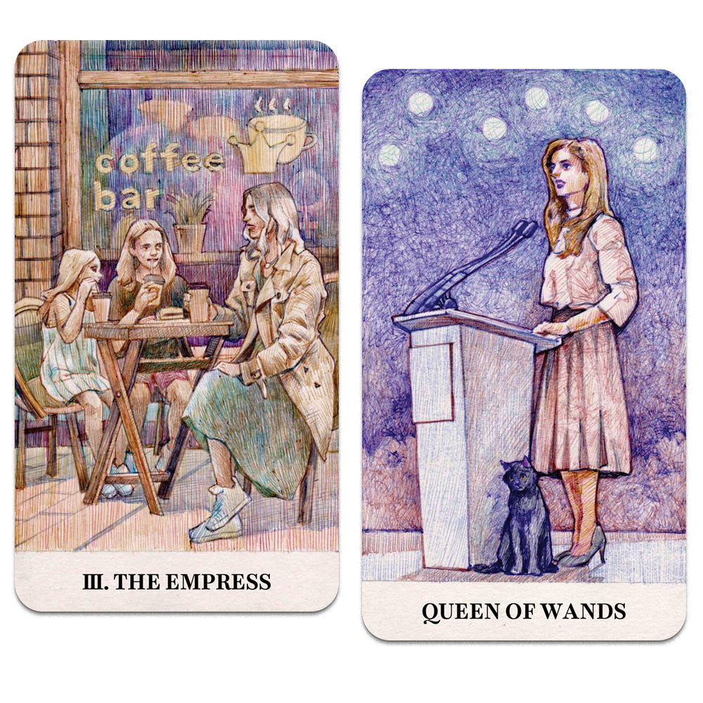 The City Labyrinth Tarot deck is about life in New York in the early 2000s. The phones, computers, and cars that the characters use are typical of the time and already seem outdated. In addition, some Arcana contain direct references to the millennium. Thus, the heroine of The High Priestess resembles the Oracle from the film ‘The Matrix,’ and the card The Tower depicts a tragic terrorist attack on the Twin Towers.