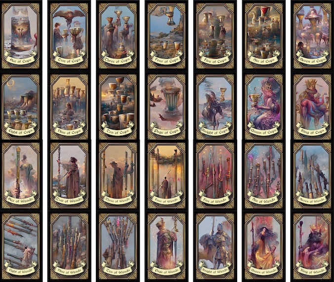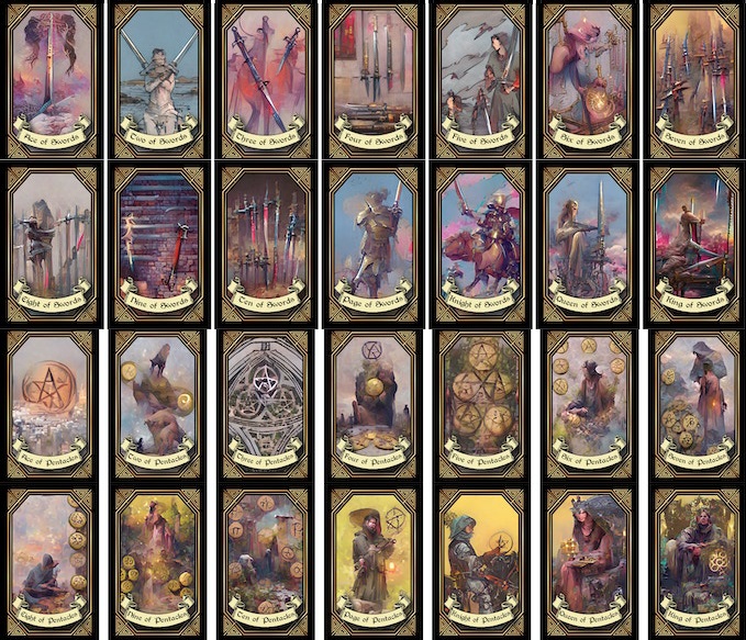 The Fusion Tarot deck is a 78 card pack complete with the traditional Major and Minor Arcana. Every one of which was molded through the careful insertion of words and ideas fed into the AI generator, which in turn, produced images relating to the ideas. Some were fast and easy, others took considerable time and effort to formulate the vision I had. But each and every card was created in the same fashion. The end result was a truly beautiful meld of human and AI creativity.
