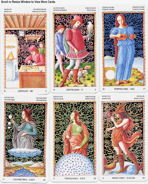 Although this breathtakingly beautiful deck is not a standard tarot deck, there is no doubt of its ability to inspire and guide. These silver-gilded cards reflect all the delicacy and intricate beauty of the medieval cosmology that it depicts. Departing from the traditional division into Major and Minor Arcana, these cards are divided in five groups of ten cards each. Paralleling the medieval world view, the groupings represent: social stations of mankind, the nine Muses plus Apollo, the Liberal Arts and Sciences, the Cardinal Virtues, and the Heavenly Spheres. Because this view of life may be unfamiliar to those of us in the 21st century, the twenty-five teaching cards provide interpretations to the perhaps unknown Terpsichore, Polymnia, and Melpomene. As the light dances on the silver foil, let the Virtues direct you, the Liberal Guides guide you, and the Muses inspire you.