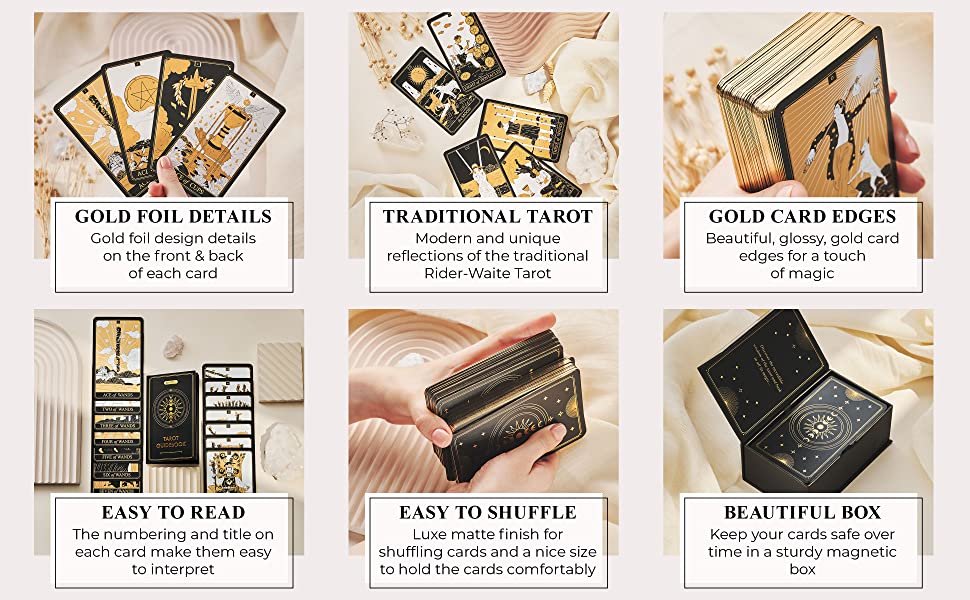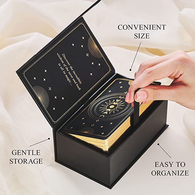 Our gold and black tarot cards are made of durable 350gsm cardstock made with a nice matte finish for shuffling tiny tarot cards in a convenient size to hold the taro cards set comfortably. It comes with a sturdy magnetic box to keep your tarrot deck safe over time