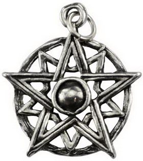A stunningly powerful piece containing both an upright pentacle and an inverted pentacle into one design. Has cord. Pewter.
