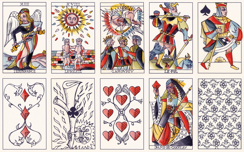 This unique tarot deck honors the legacy of Old World cartomancy by marrying a humble pack of French-suited playing cards with the classic Tarot de Marseille. Reflecting tarot’s roots as a card game, Playing Marseille takes a playful approach to reading that highlights simple, accessible folk methods and keen observation instead of esoteric symbolism. Ryan Edward’s practical system of fortune telling is easy to learn and can be enjoyed with any Marseille tarot deck. Includes 78 cards and a 56-page illustrated guidebook with card meanings, keywords, instructions and sample readings. The guidebook explains how to read the tarot though the lens of classic playing card cartomancy.