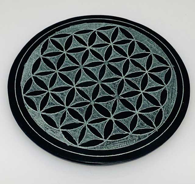 Beautiful black soapstone incense burner. A carved symbol of the flower of life is on the top of this ash catcher. Five holes are drilled in the middle to hold your favorite incense sticks. 4" wide and made in India