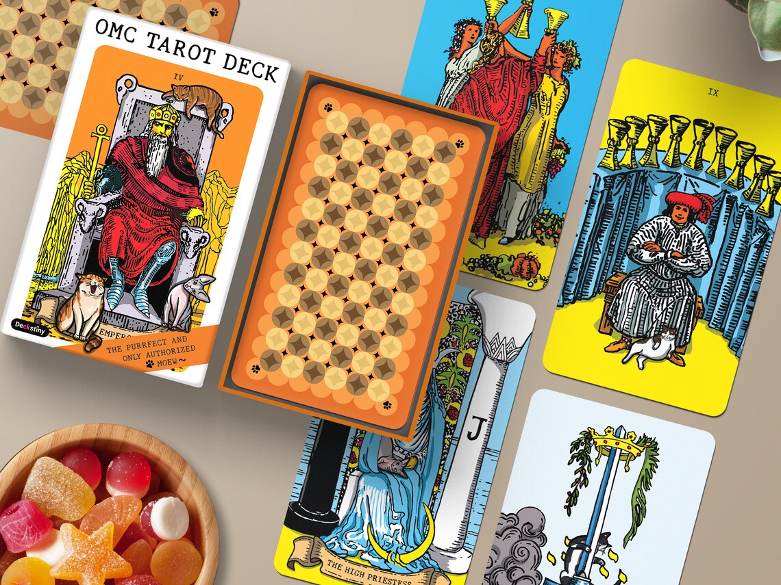 OMC 塔羅牌是證明他們比人類優越的一種渴望。誰不曾是這些時而可愛、時而專橫的小毛球的僕人呢? 無論如何,他們決定揭開 Rider Waite Smith 塔羅牌的所有奧秘,這將使經典 RWS 愛好者更容易閱讀。你準備好接受咕嚕聲療法了嗎?