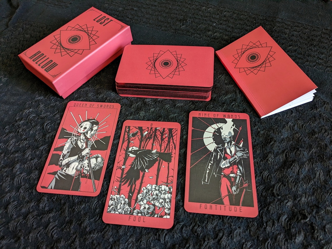 Each card is drawn in a red, black and white color scheme that keeps the whole deck unified in one consistent look and feel. The characters in the deck are a diverse cast that bring to life the varied beauty of the setting and its inhabitants. Every card meaning has a considered mediation between its different sources and as such you will see a melding of traditions.