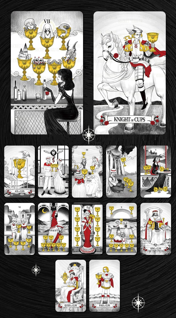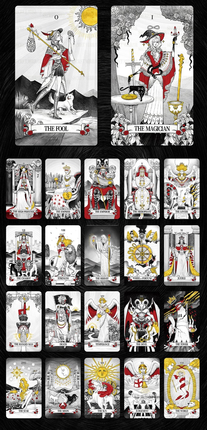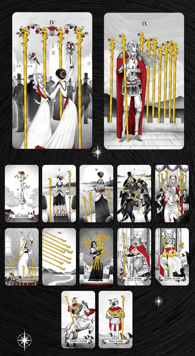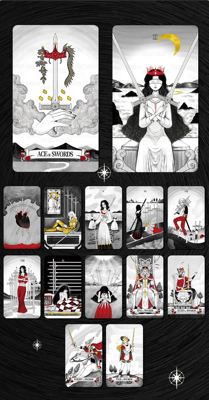 用 Secret Mirror Tarot 解開你內心的秘密。它的 78 張卡牌中的每一張都在單色領域內精心製作,充當直觀探索和精神洞察的管道。深入探討黑、白、紅、金的豐富象徵意義,每種顏色都反映了靈魂的旅程:從平靜的內省到熾熱的決心,從對光明未來的微光希望到新開始的無限可能。
