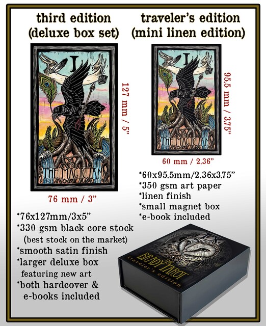 Printed on 350 gsm art paper with a matte linen finish, the cards will measure 2.36" x 3.75" (60 mm * 95.5 mm). The box will be a small chipboard box with a magnetic closure.