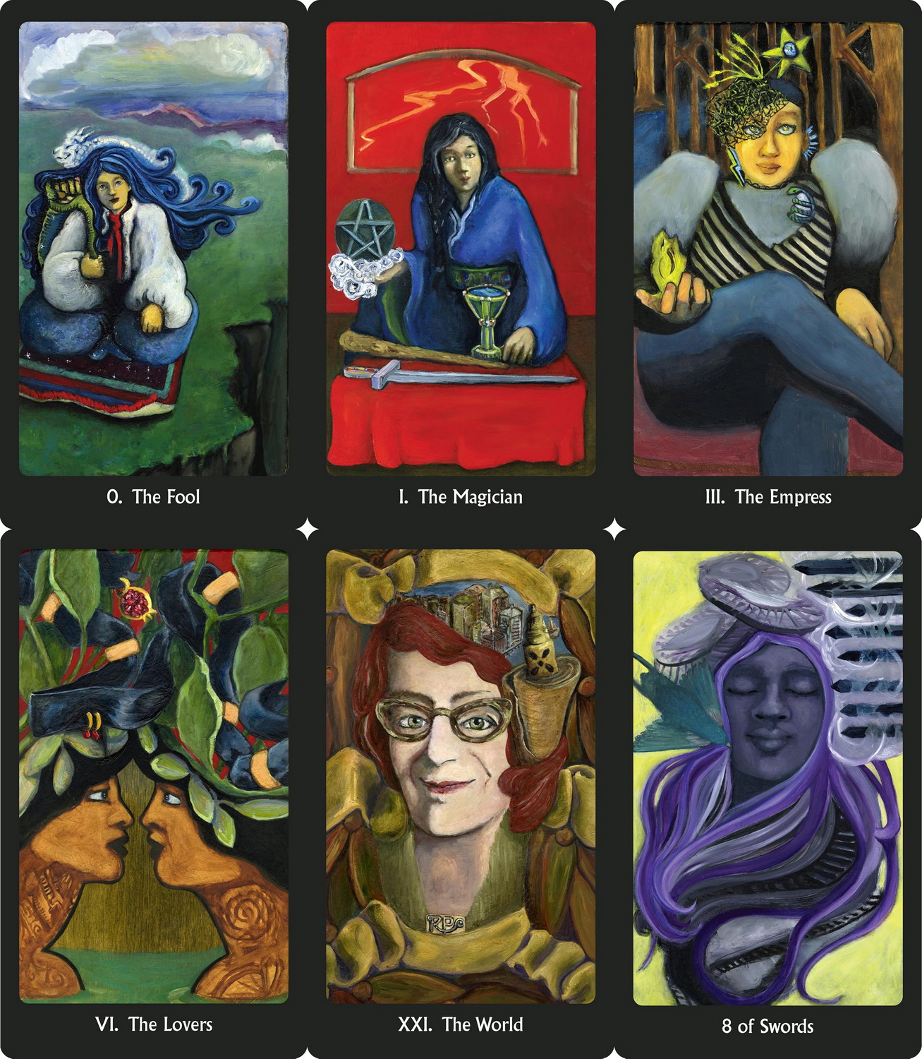 Gorman’s artwork has been displayed in galleries throughout the US and can be found in private collections worldwide. She is well known for her painting of her mentor, tarot icon Rachel Pollack, portrayed in this deck as The World card.