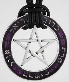 The Sephiroth are the 10 attributes and emanations through which God reveals himself, and creates both the physical realm and the metaphysical realms, as spoken of within Kabbalah texts and traditions. Here we find them used to create a magical seal, in the form of a pentagram. With the interwoven star gleaming brightly in the middle, the circle around it is inscribed with these mystical markings, and are in turn encased within translucent purple glass, making this piece both a stylish piece of jewelry and a powerful magical charm. Hanging approximately 1 3/4" in diameter and is sculpted of English Pewter, it is suspended from leather straps that extend for approximately 28" in length, and close with a pewter clasp.