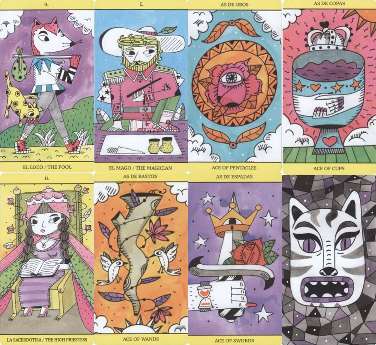 This funny, very colorful tarot deck is a kind of pip deck with a breeze raider waite and a bit of Marseille tarot. The illustration of the cards is very colorful and imaginative.