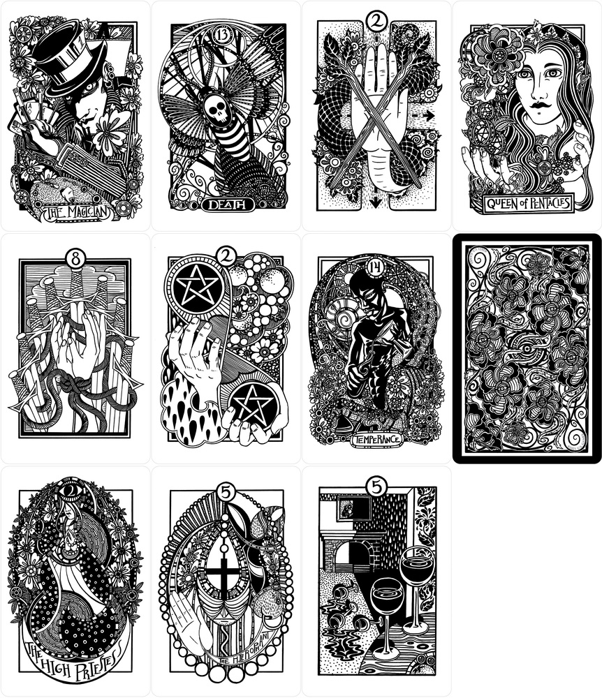 The Heart & Hands Tarot deck represents a personal journey and a true labor of love created over the course of several phases of life by artist and illustrator Liz Blackbird. The deck’s eclectic imagery is rooted in the traditional figures and symbolism of the classic Rider-Waite-Smith Tarot deck and is stylistically unified by an intricate line-drawing technique. Flowers and figures spill from the images' frames—the exuberance of the illustrations reflects the power of the cards and the artist's joy in creating them.