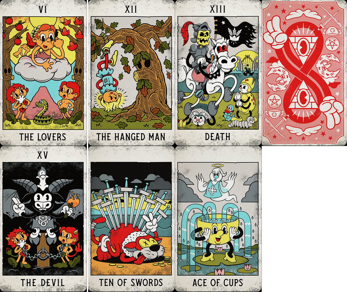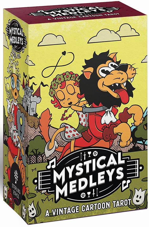 Mystical Medleys: A Vintage Cartoon Tarot is a tarot deck inspired by the iconic vintage cartoons of the 1930s. If you love wild rubber hose animation and the art of cult, indie hit game Cuphead (2021 Netflix series!), this is the deck for you! A truly fresh take on an ancient tradition, Mystical Medleys brings lighthearted fun and madcap energy to the tarot. It's ideal for occultists of all varieties, animation and cinema buffs, and lovers of all things vintage!
