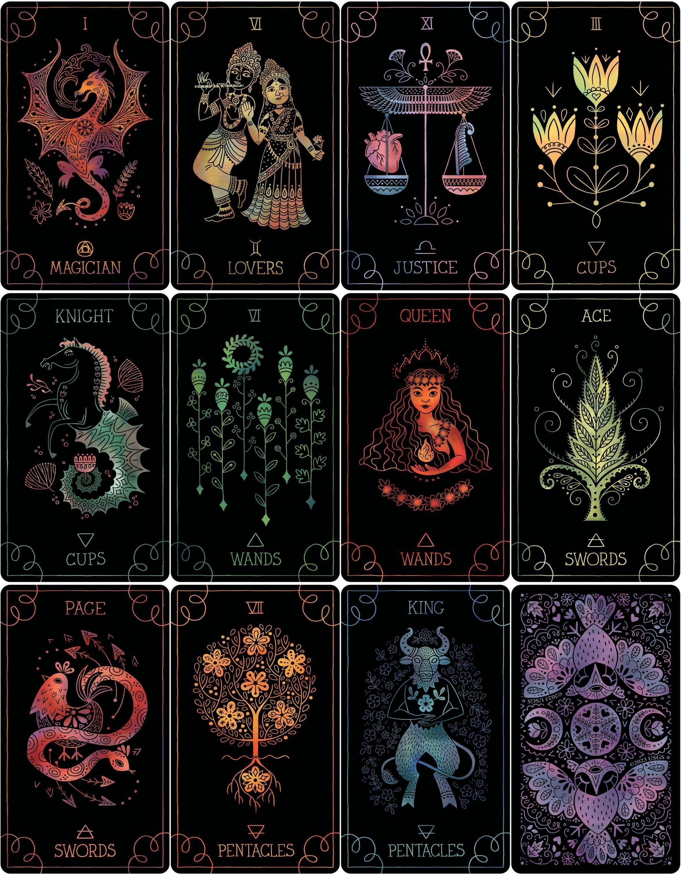 Inspired by rich mythological traditions, Folklore Tarot presents deep universal truths about the nature of our world. Though originating from diverse cultures, the stories of myth and legend share common themes, pathways and archetypes, which are woven into powerful symbols of tarot. Folklore Tarot bridges the gap between the past and the present, bringing the wisdom of ancient beings to guide us on our current journey. Every pip card is illustrated with intricate floral elements, while the court cards and Major Arcana feature characters from world mythology.