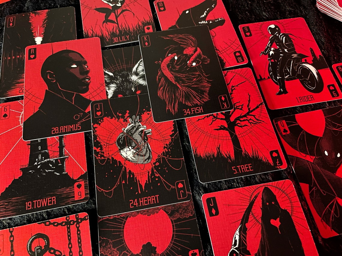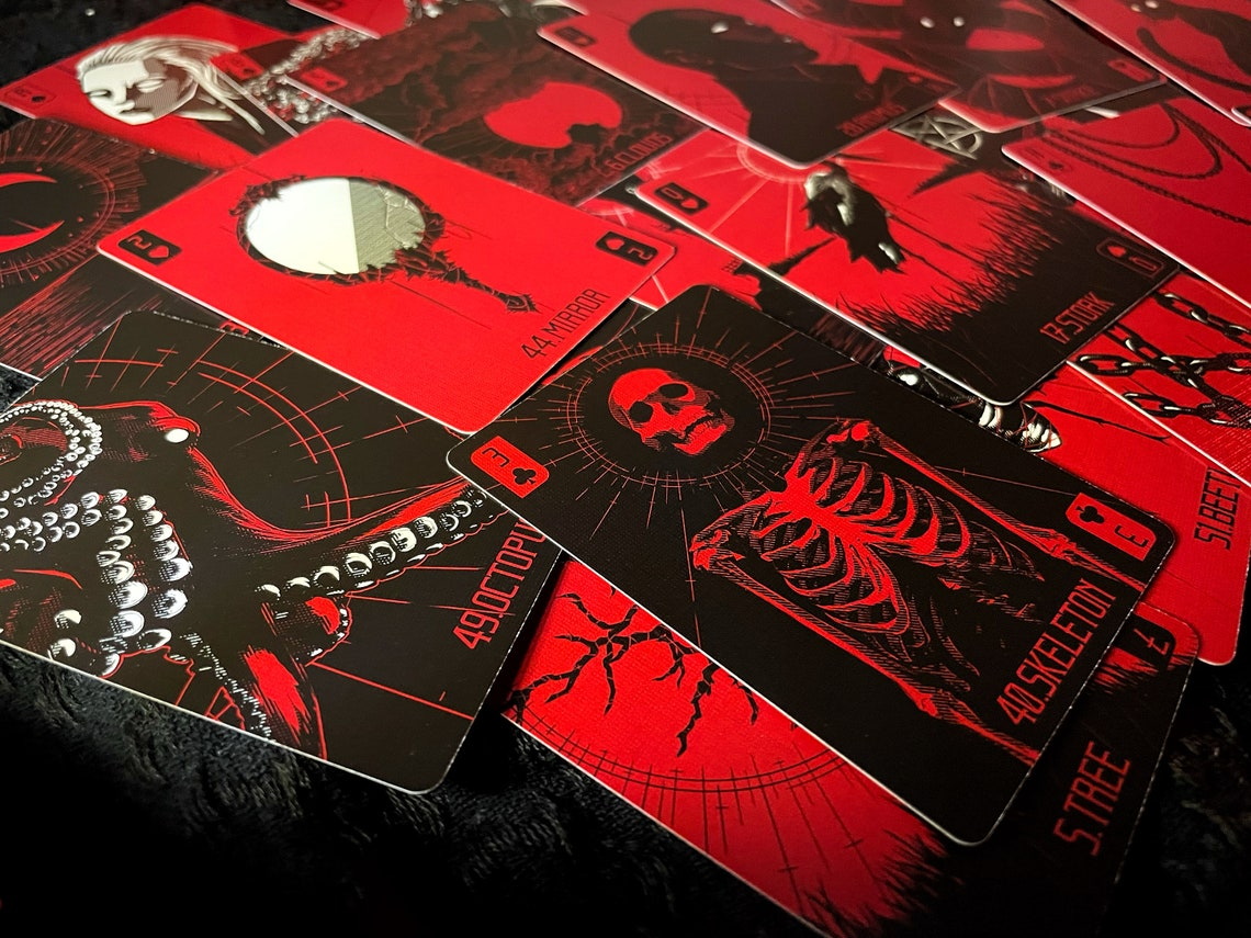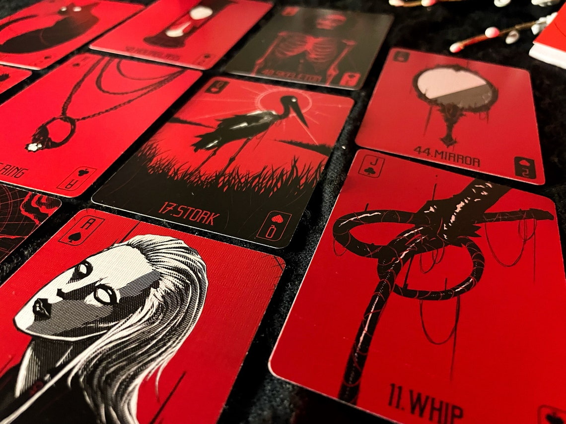 The Red Hand Lenormand is an extended Lenormand deck featuring 54 unique illustrations that depict a gracefully gothic setting. Aside from the standard 36 Lenormand cards, I’ve included an additional 18 that expand the options one can read with. It can be used as a regular Lenormand deck, an expanded Lenormand/Oracle deck, or just a pretty playing card deck according to your preferences.