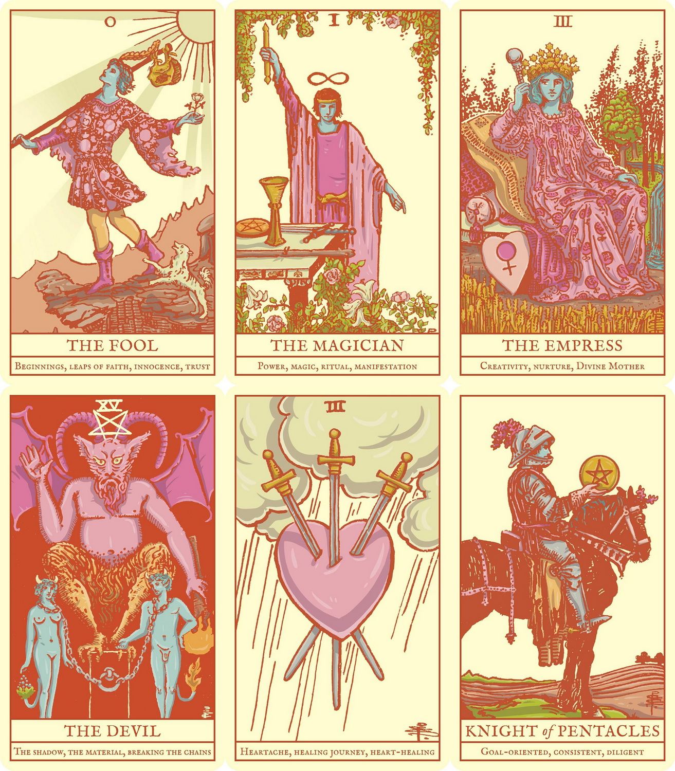 Cute colours and a modern take on the traditional Rider-Waite-Smith tarot make this fabulous deck stand out. Unlike standard tarot decks, this one includes the meanings on the cards, creating an easy-to-use introduction to tarot reading—no booklet needed to start with, but one is included to develop your practice.